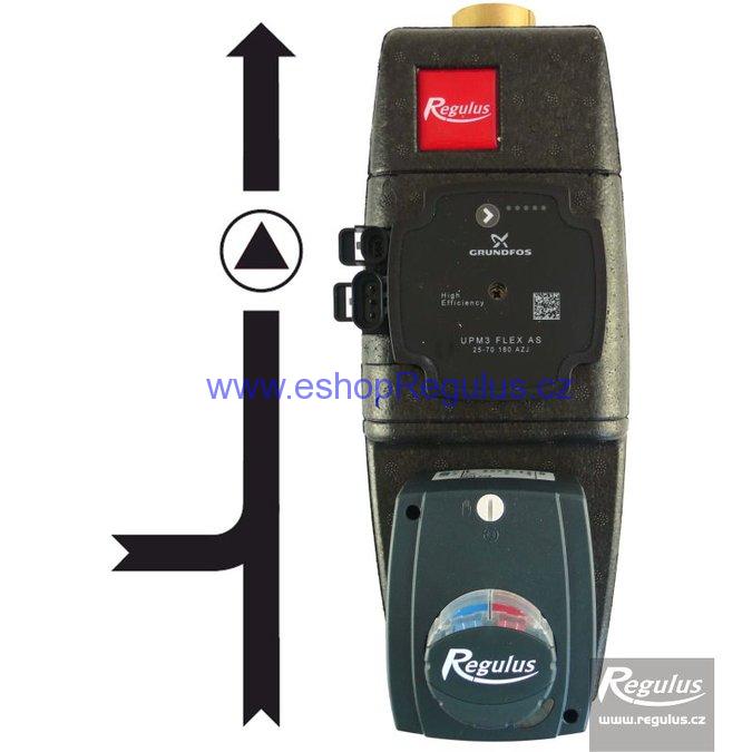 Čerpadlová skupina v izolaci s 3c směšovacím ventilem (Kvs = 6,3 m3/h) s pohonem s 3bodovým ovládáním 230 V, s nízkoenergetickým čerpadlem Grundfos UPM3 25-60. Připojení sm. ventilu 2 x 1" M pro šroubení a 1" F u čerpadla.